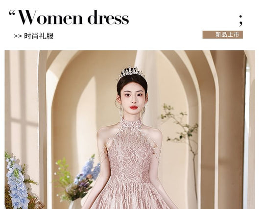 Fringed Evening Layered Halter Gown Floral Neck Sequin A-Line