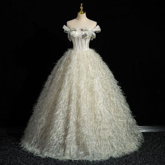 Gown Evening Sleeveless Mesh Fringed A-Line Off-Shoulder Sequin
