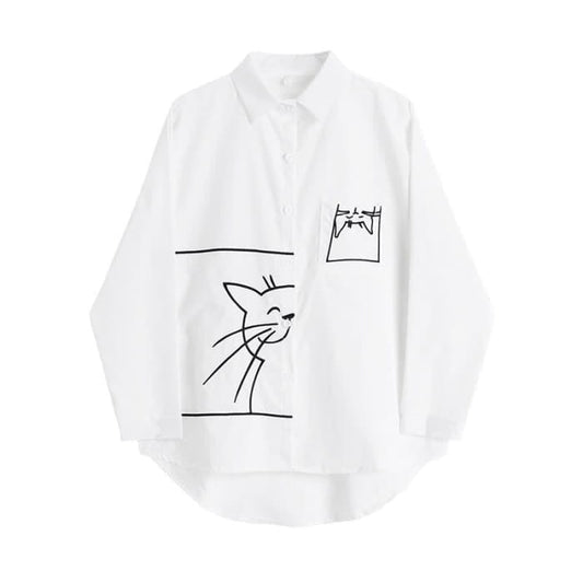 Cartoon Kitty Embroidery Pocket Loose Polo Shirt