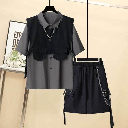 Gothic Buckle Pocket Vest Lapel T-Shirt Chain Cargo Shorts Pants