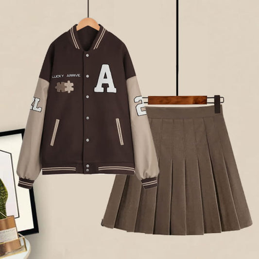 Letter Embroidery Baseball Jacket Pleated Skirt Set