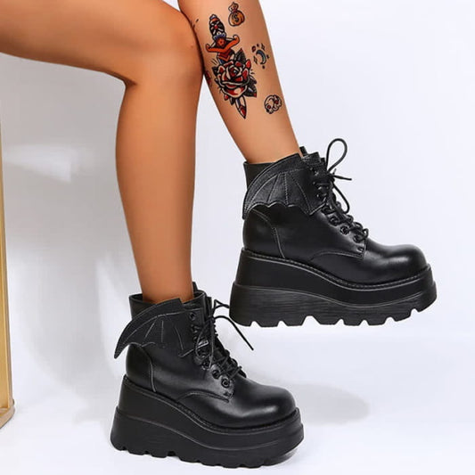 Black Punk Goth Wings Lace Up High Wedge Boots