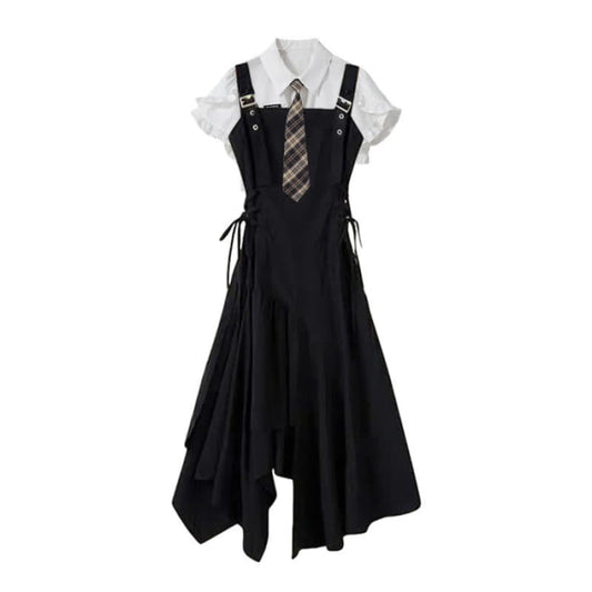JK Flouncing Sleeve Tie Polo T-Shirt Irregular Lace Up Suspender Dress