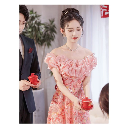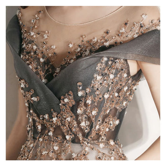 Short-Sleeve Off Shoulder Glitter Panel Mesh A-Line Evening Gown