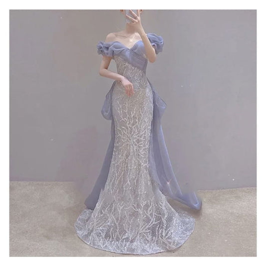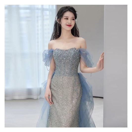 Short-Sleeve Off Shoulder Gradient Sequin Panel Mesh Mermaid Evening Gown