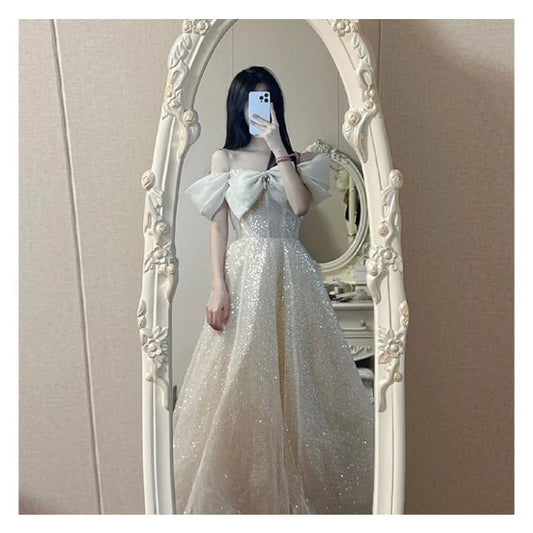 Cold-Shoulder Sequin Bow A-Line Evening Gown
