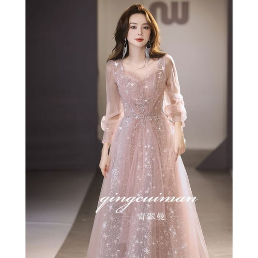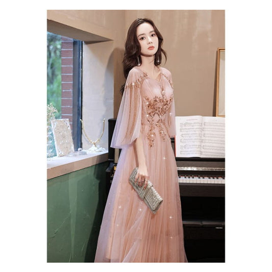 Long-Sleeve V-Neck Sequin Mesh A-Line Evening Gown