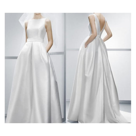 Sleeveless Boat Neck Plain Satin A-Line Wedding Gown