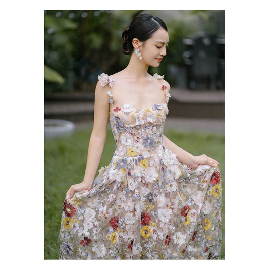 Spaghetti Strap Floral Print Mesh Midi A-Line Evening Dress