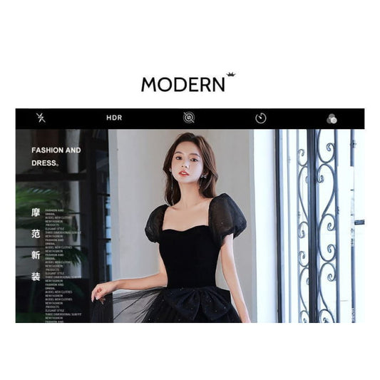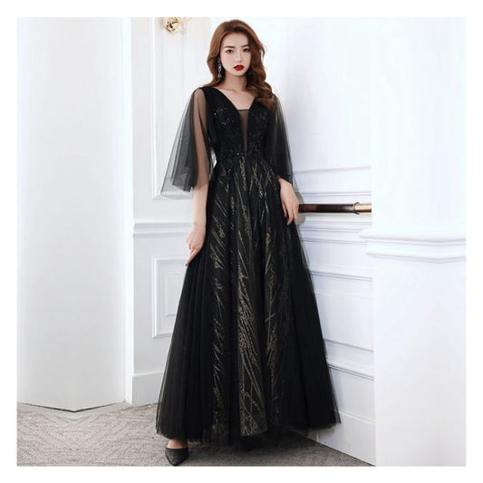 Puff-Sleeve Mesh Panel Plain A-Line Evening Gown