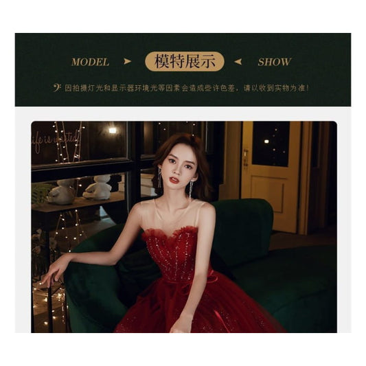 Strapless Fluffy Trim Sequined A-Line Evening Gown