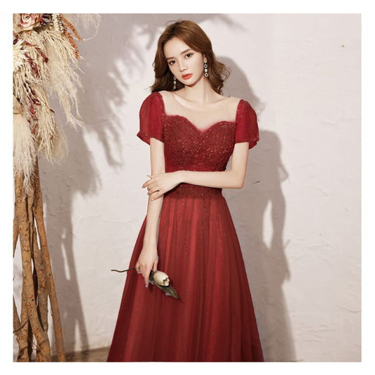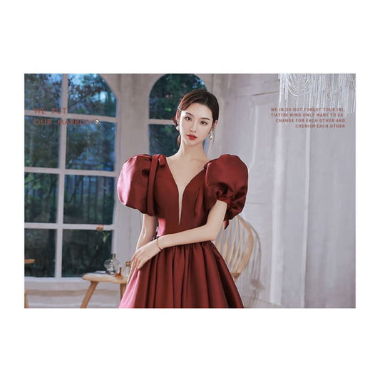 Puff-Sleeve Square-Neck Lace-Up Back A-Line Evening Gown (Various Designs)