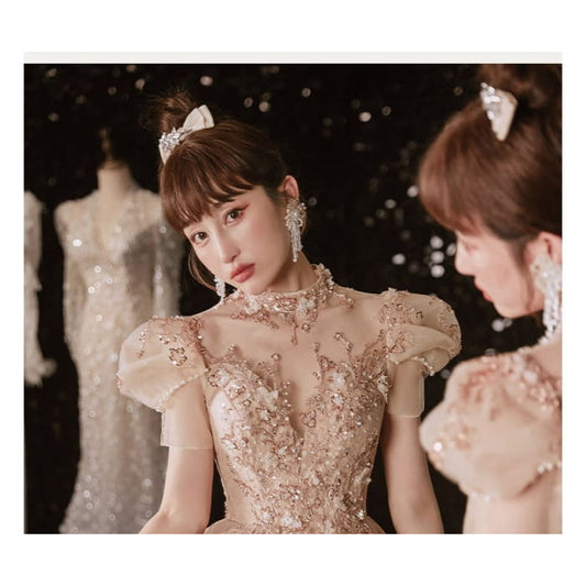 Short-Sleeve High Neck Floral Embroidered A-Line Evening Gown