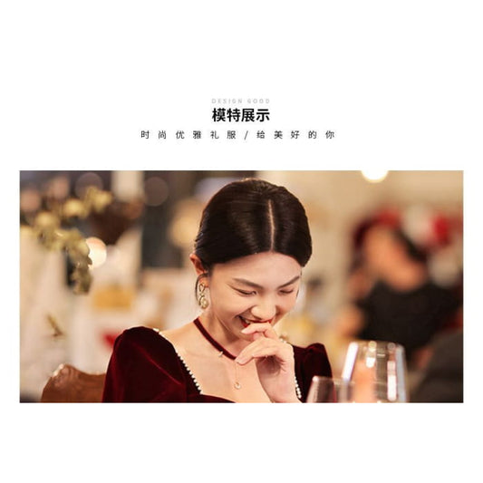Short-Sleeve Sweetheart Neck Flower Embroidered Faux Pearl Velvet Maxi A-Line Cocktail Dress