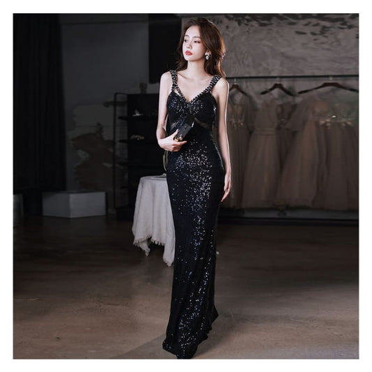 Sleeveless V-Neck Sequined Mermaid Evening Gown