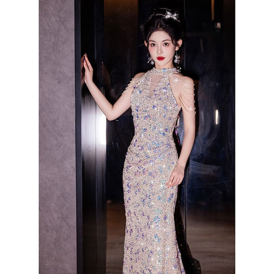 Sleeveless Halter Neck Sequined Maxi Evening Dress