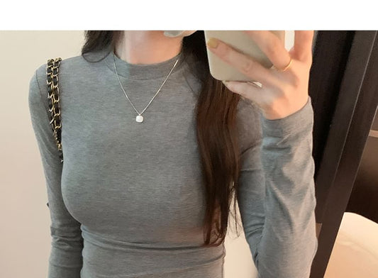 Mock Two-Piece Long-Sleeve Square Neck Floral Panel Slim Fit T-Shirt