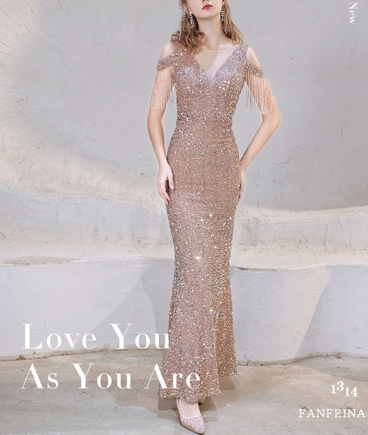 Sequin Trumpet Fringe Sleeve Beaded Shoulder Evening Cap Dress Cold