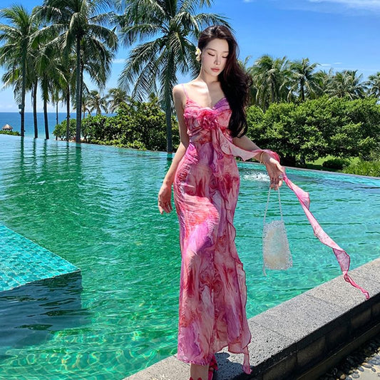 Accent Midi Tie A-Line Trim Dye Strap Spaghetti Ruffle Sundress Flower