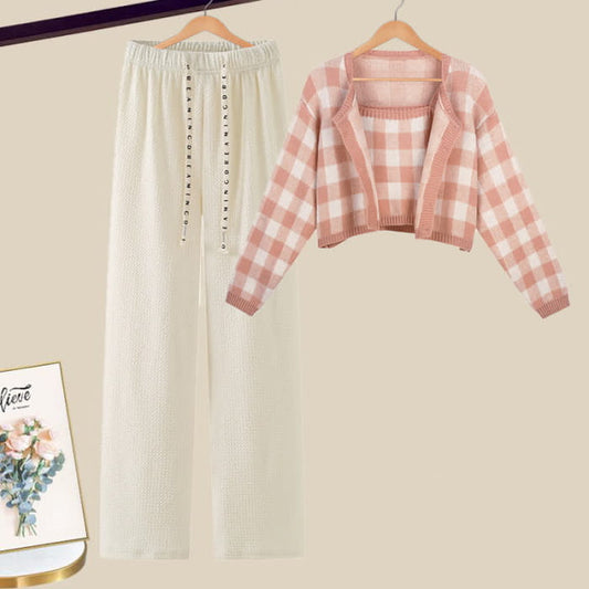 Pink Plaid Top Cardigan Sweater White Pants Set