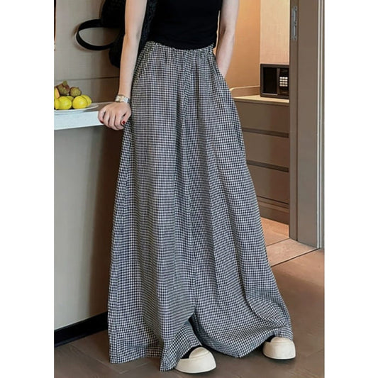 Casual Black Plaid Pockets Elastic Waist Wide Leg Pants VB1045