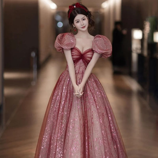 Sleeve Evening Puff Square Gown Plain Neck A-Line