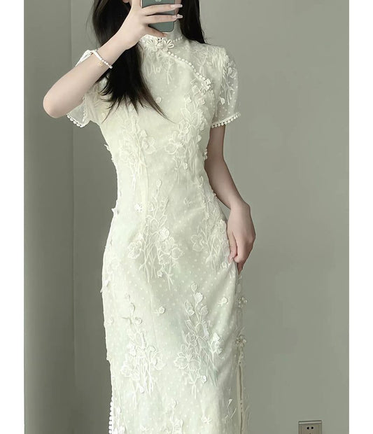 Short-Sleeve Floral Jacquard Faux Pearl Slit Midi Qipao
