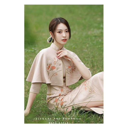 Set: 3/4-Sleeve Floral Midi Qipao + Capelet