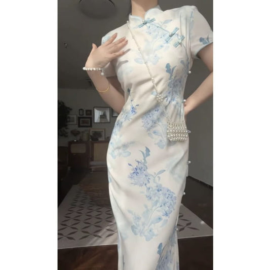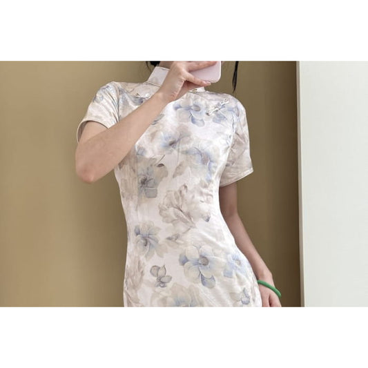 Short Sleeve Mandarin Collar Floral Print Midi Qipao