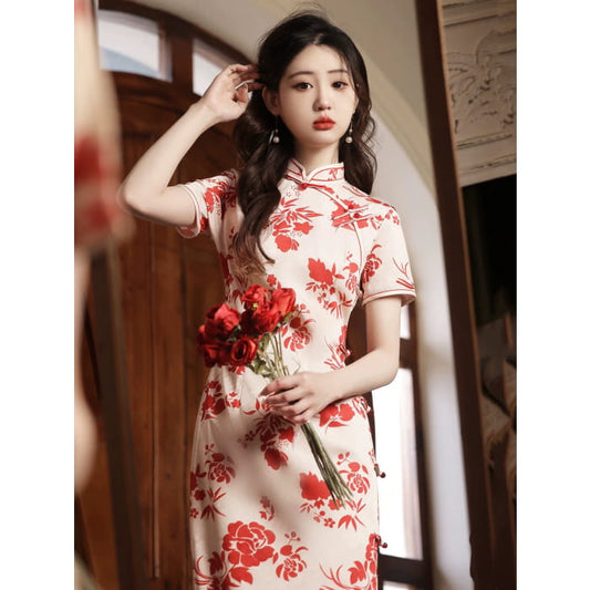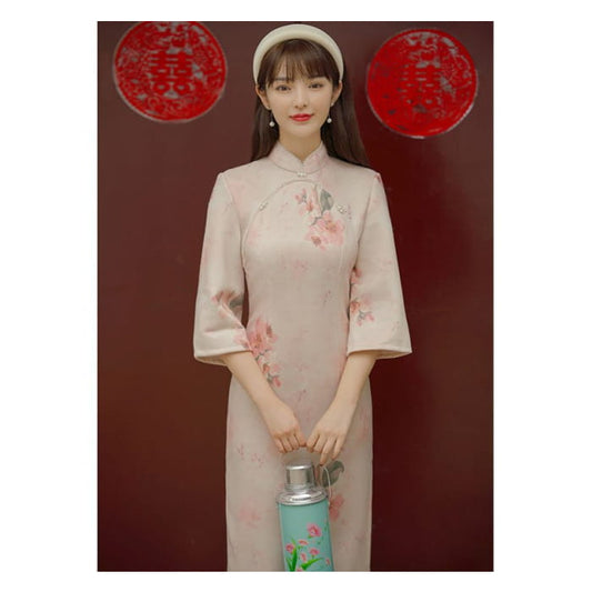 3/4-Sleeve Floral Print Faux Pearl Faux Suede Midi Sheath Qipao
