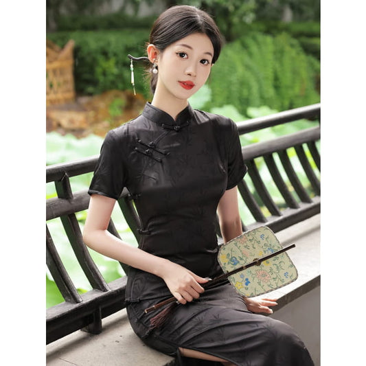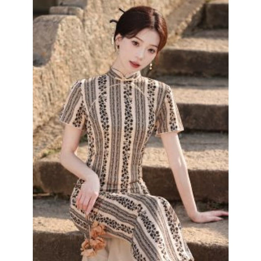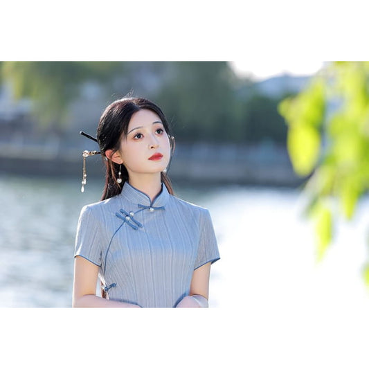 Short-Sleeve Stand Collar Striped Frog Buttoned Slit Midi Sheath Qipao