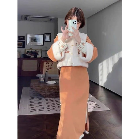 Floral Fluffy Trim Frog Button Vest / Long-Sleeve Midi Qipao / Set