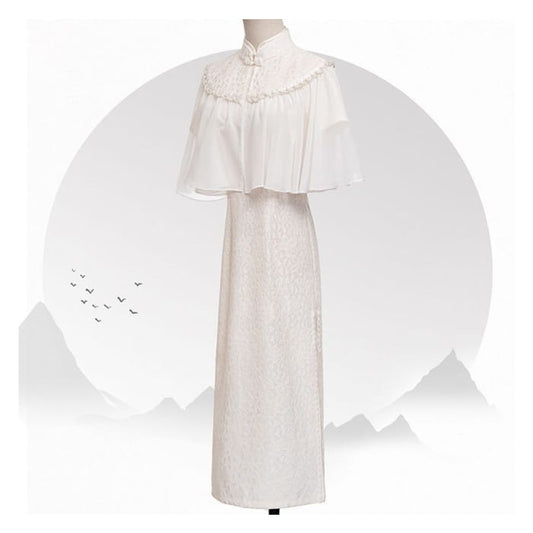 Set: Short-Sleeve Lace Midi Qipao + Faux Pearl Capelet