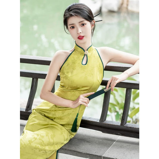Sleeveless Halter Neck Keyhole Floral Print Maxi Qipao