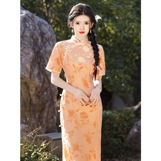 Orange Floral Sleeveless Long Cheongsam