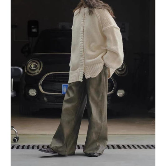 Tie-Neckline Cable-Knit Round-Neck Cardigan