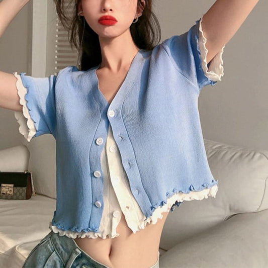 Short-Sleeve V-Neck Frill Trim Button-Up Cardigan