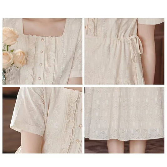 Short-Sleeve Square Neck Plain Lace Trim Midi A-Line Dress