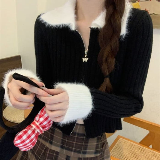Two Tone Zip Ribbed Cropped Knit Top