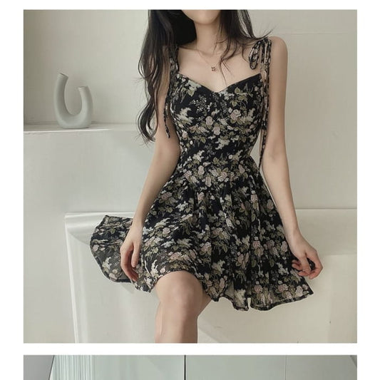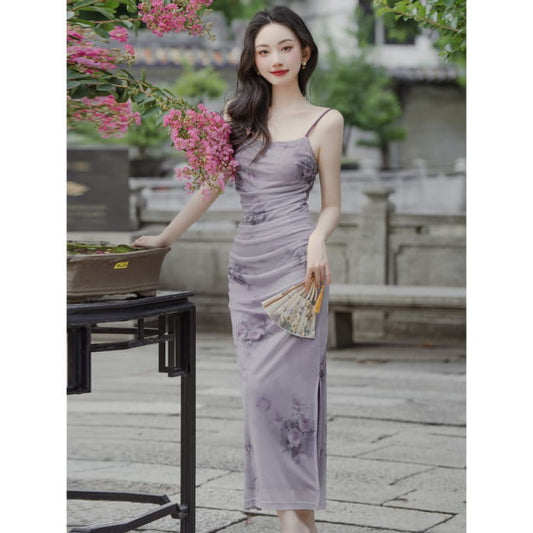 Set: Spaghetti Strap Floral Print Ruched Slit Midi Sheath Dress + V