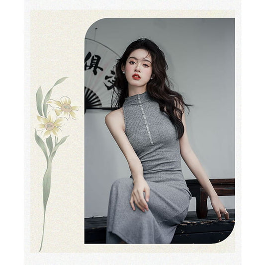 Sleeveless Mock Neck Plain Midi Sheath Dress / Plain Long Cardigan / Set