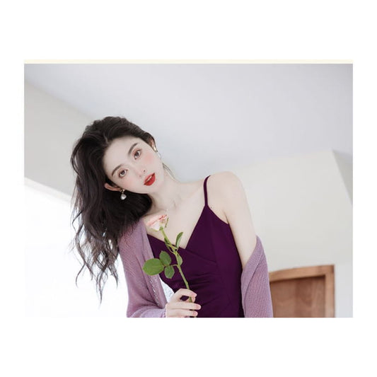 Set: Spaghetti Strap Scoop Plain Midi Sheath Dress + Plain Long Cardigan