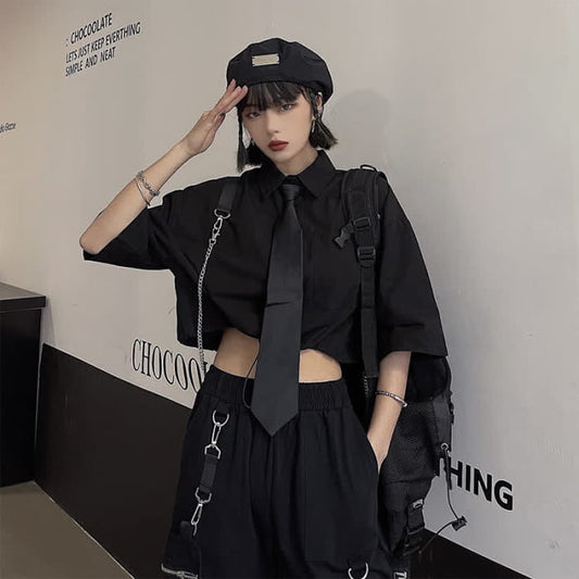 Black Strap Chain Tie Lapel T-Shirt Wide Leg Cargo Shorts