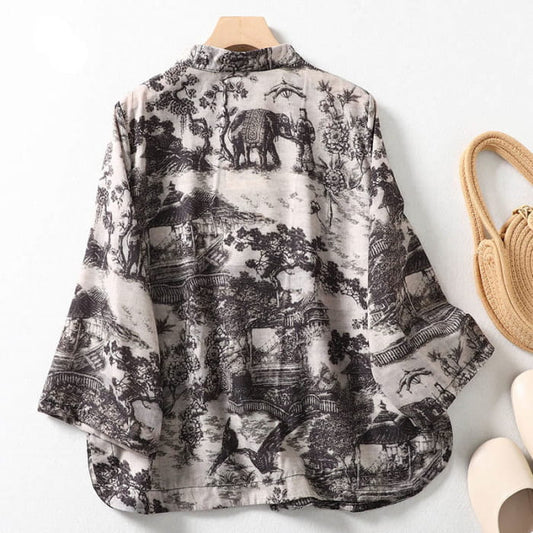 Retro Ink Print Stand Collar Shirt