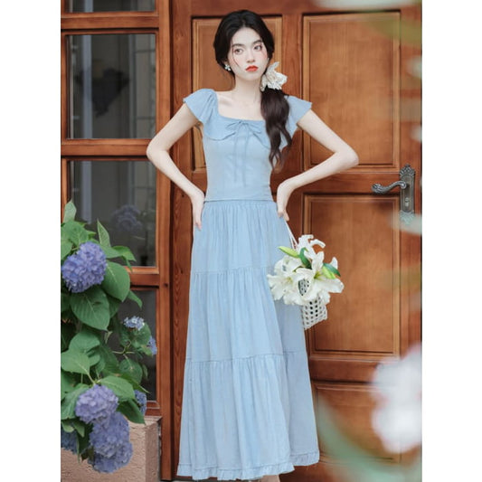 Set: Oberteil mit Flügelärmeln, quadratischem Ausschnitt, schlichter Schleife und Rüschen + Maxi-Stufenrüsche mit elastischer Taille