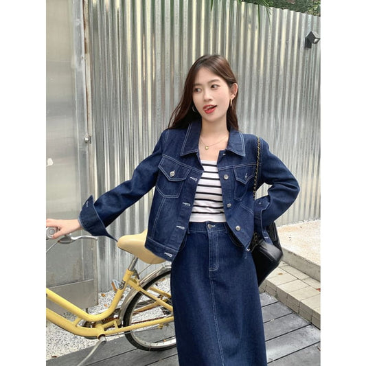 Set: Collared Plain Denim Button Jacket + Mid Rise Denim Midi A-Line Skirt