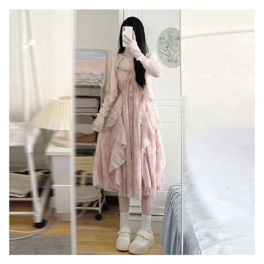 Midi-A-Linien-Kleid mit Spaghettiträgern und Blumenmuster / Schlichte Strickjacke mit Bindeband vorne / Set