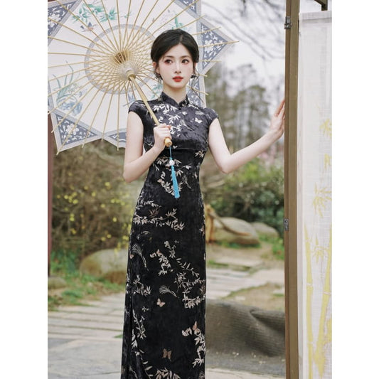 Maxikleid aus Samt mit Flügelärmeln und Blatt-/Schmetterlings-Print