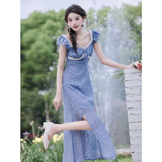 Flügelärmelchen, quadratischer Ausschnitt, Blumendruck, Rüschenschlitz, Bindeband vorne, Maxi
