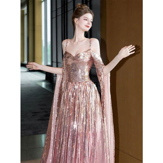 Cape-Sleeve Gown A-Line Evening Cold-Shoulder Sequin